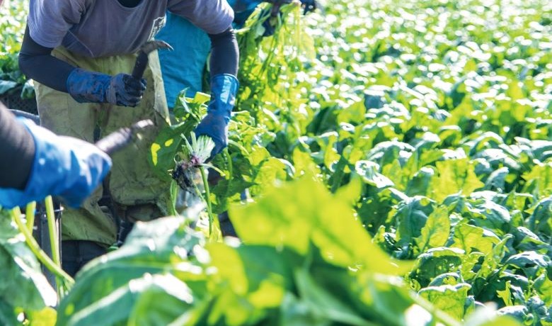 ほうれん草の栽培は天候との勝負。とにかく繊細で保存が難しいので、手間暇を惜しまず広大な畑をまわりながら発育状況を確認し、保存の際の温度管理に至るまで心を配ります。