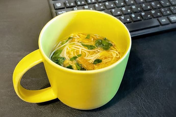 仕事が遅くなった時に、マグカップに入れてデスクでさっと食べています。そうめんまで入っているので食べた際の満足感と、あっさりした和風の味わいスープは最後まで飲み干せるのがお気に入りポイントです。