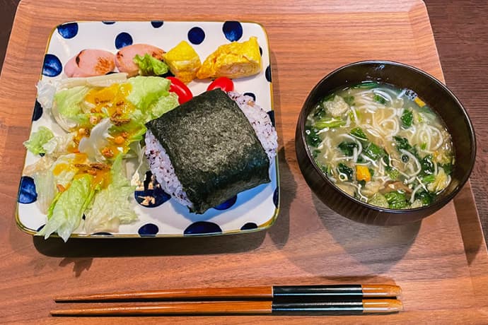 簡単なおかずの朝ごはんに、おみそ汁代わりににゅうめんをプラス。具材の食感と、味噌味のスープがおにぎりとも相性が良く、朝から体も温まる一杯です。